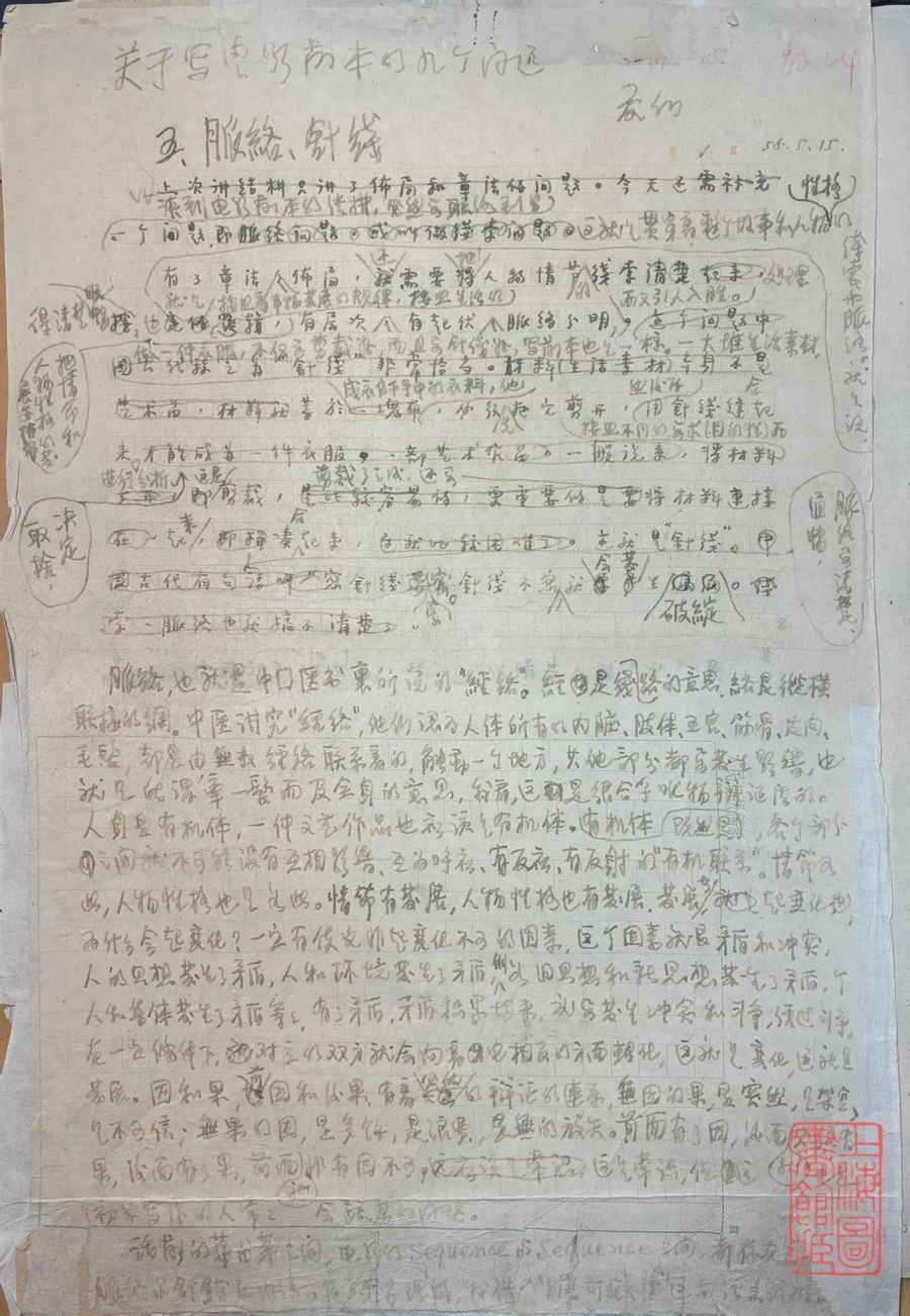“人民叙事”将笔墨集中于电影文学剧本与影评。电影文学剧本是电影创作的起点,电影评论是对电影作品的接受与交流。它们是电影文献的重要构成,反映了各个时期电影工作者对电影艺术中的人民性、民族性的思考与实践。夏衍《关于写电影剧本的几个问题》初稿写于1958年,原是夏衍在北京电影学院讲课时的讲稿,后发表于《中国电影》杂志,此次展出的第五部分《脉络和“针线”》将中医文化与电影文化相联系,以中医“经络”概念作比喻,将文艺作品视作有机体,以说明故事情节、人物性格的相互联系与变化发展规律。