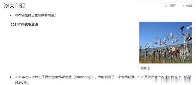 根据内衣墙的百度百科内容,我们可以找到,在澳大利亚的昆士兰州,共有两道内衣墙,位于南部的内衣墙早在2011年的时候,就已经创造出一项关于内衣墙的世界记录,在当时就有16.6万的女性内衣挂着了铁丝上,足足有163公里长。