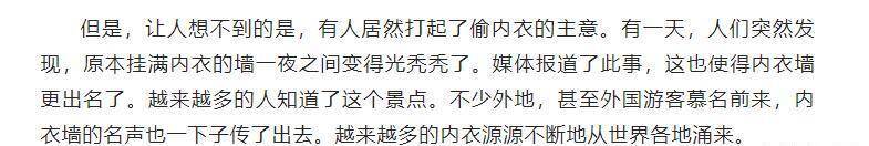 但是没想到,内衣墙一事一经报道后,更多的人知道了这个景点,很多外国游客慕名前来,内衣墙的人气也比之前更火爆了,每天都在接连不断的接收,来自不同国家的女性内衣。