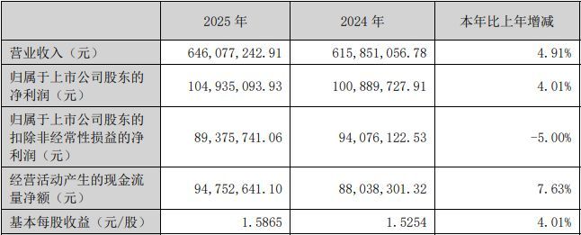 瑞迪智驱(SZ301596,股价73.46元,市值56.69亿元)4月22日晚间披露2025年年报,公司2025年实现营收6.46亿元,同比增长4.91%;实现归属于上市公司股东的净利润1.05亿元,同比增长4.01%;实现扣非净利润约8937.57万元,同比下滑5.00%。公司拟以总股本7716.53万股为基数,向全体股东每10股派发现金红利2元(含税),不送红股,并以资本公积金向全体股东每10股转增4股。