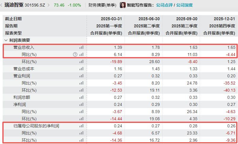 纵向来看,6.46亿元的营收和1.05亿元的归母净利润,均创下瑞迪智驱单一会计年度新高。分季度来看,瑞迪智驱2025年第四季度实现营收1.65亿元,同比下滑4.44%,环比增长1.25%;实现归母净利润0.26亿元,同比下滑6.71%,环比下滑9.36%。