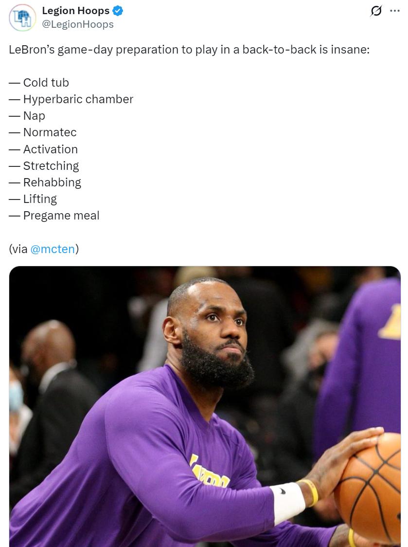 戴夫-麦克梅纳明透露过41岁的詹姆斯为了出战背靠背两场比赛有多么的自律:冷水澡、高压氧舱、小睡、玩一会游戏、冰敷膝盖45分钟、拉伸、康复治疗、力量训练、赛前餐。
