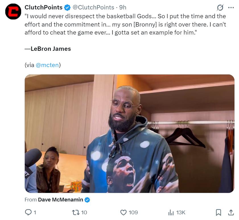 在这场比赛后,詹姆斯接受ESPN记者戴夫-麦克梅纳明采访,他说道:我绝对不会亵渎篮球之神,我为了这项我热爱的运动投入了时间、精力、努力。我的儿子就在场边看着,我是绝对不会辜负这项运动的,我必须为他树立榜样。