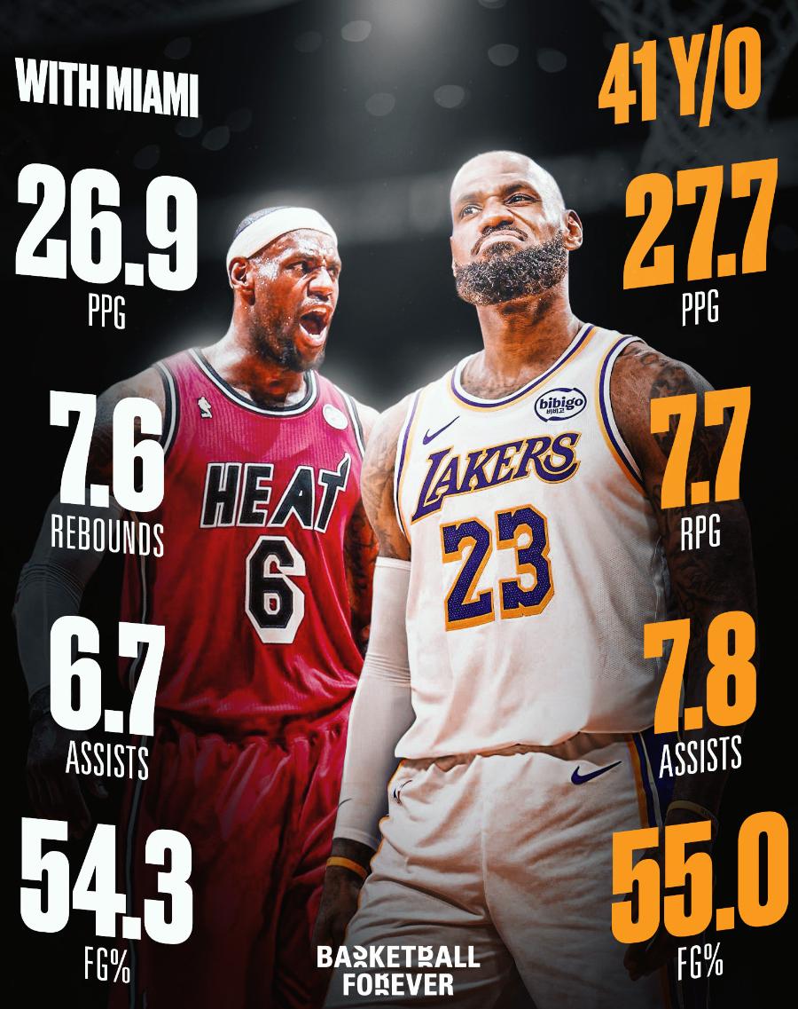 年满41周岁后,勒布朗场均27.7分7.7篮板7.8助攻1.3抢断0.3盖帽,命中率55%,谁能想到41岁的勒布朗比热火27-28的勒布朗数据还要出色一点?