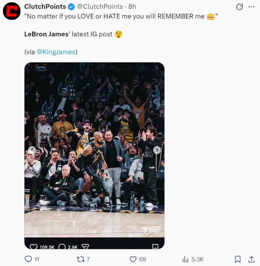 几小时前勒布朗在个人IG更新了一句话:不管你是爱我还是恨我,但你一定会记住我。(他发布的是对阵老鹰比赛的图)老头也知道很多人还在骂他,但他根本无所谓。