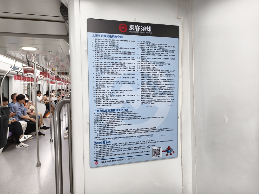 笔者也进行了实地调查,发现目前车厢内“禁止电子设备外放”提醒比较欠缺。例如,笔者乘坐了地铁2号线、7号线、12号线、13号线等,发现每节车厢里只有一张显著标注“禁止电子设备外放”的海报,以及另一张文字很小的《乘客守则》海报。它们张贴在车厢连接处不太起眼的墙上。对车厢中部的乘客而言,完全看不到这两张海报。