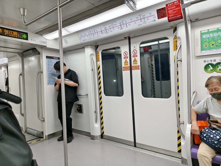 车厢广播播报“使用电子设备时禁止外放声音”的次数也非常少。以13号线为例,笔者从大渡河路站上车,汉中路站下车,经历了6次完整的站点播报,但只有一次听到“禁止外放”的提醒。