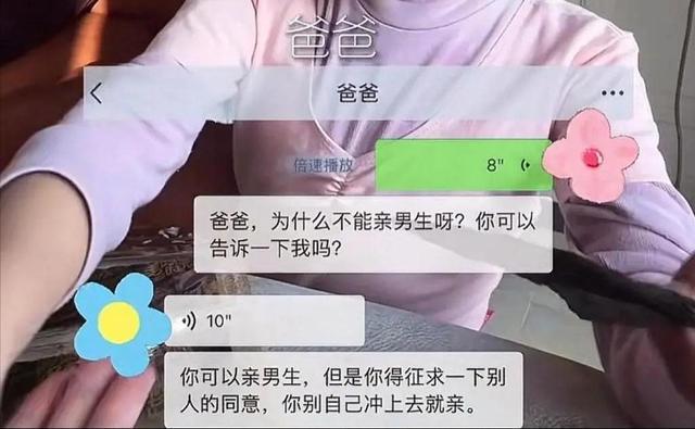 视频里,女儿奶声奶气问爸爸:为什么不能亲男生。