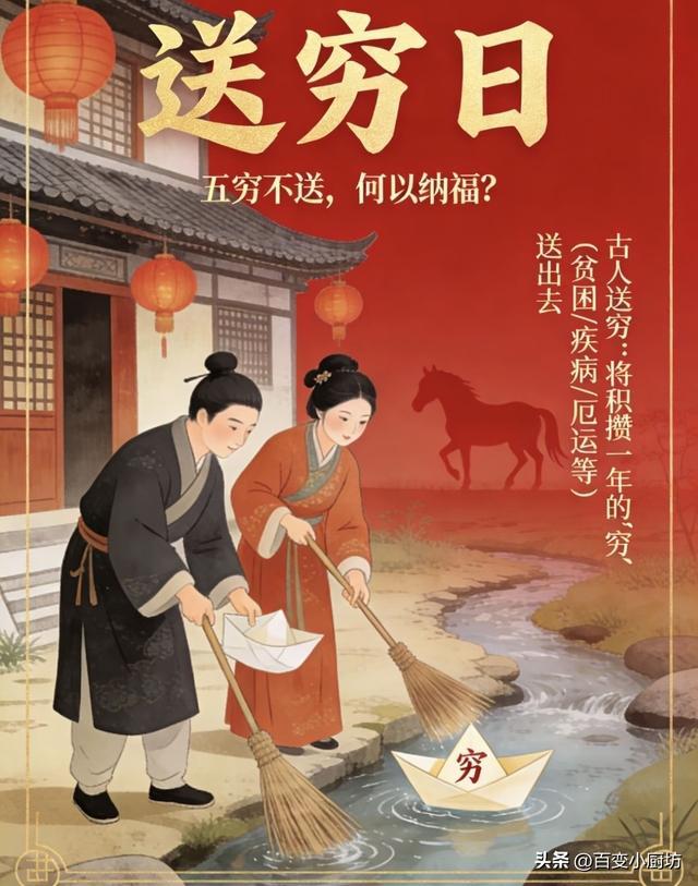 要理解送穷的讲究,先要弄清这一习俗的由来与内涵。送穷节是中国最古老的岁时民俗之一,最早可追溯至唐代,在宋代广为盛行,古籍《岁时广记》《图经》中均有明确记载:“池阳风俗,以正月二十九为穷九日,扫除屋室尘秽,投之水中,谓之送穷。”唐代诗人姚合更在《晦日送穷》中写道:“年年到此日,沥酒拜街中。万户千门看,无人不送穷。”足见这一习俗的千年传承。